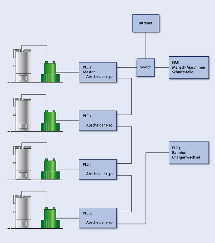 Jede PLC arbeitet unabhängig mit einem eigenen Vakuumerzeuger und einem eigenen Zentralfilter. Es werden die Füllstände überprüft. Wird Materialbedarf bei einem Abscheider detektiert, wird der Materialbedarfszustand aller Abscheider dieser PLC eingefroren. Die Abscheider werden jetzt der Reihe nach befüllt. Das „einfrieren“ der Materialbedarfe stellt sicher, dass die Abscheider nach dem FiFo-Prinzip befüllt werden, außerdem können dadurch